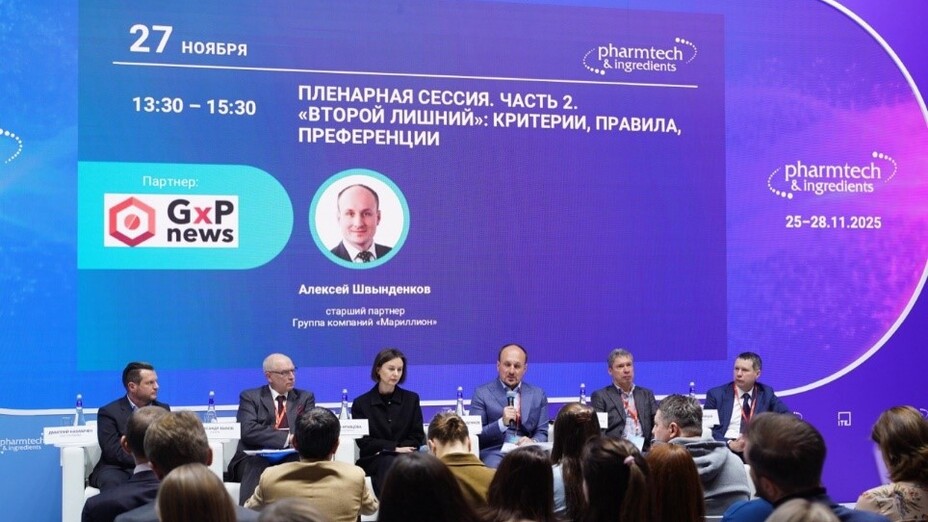 27 ноября 2025 года в рамках 27-ой «Международной выставки оборудования, сырья и технологий для фармацевтического производства» состоялась ключевая пленарная сессия, посвящённая правилу «второй лишний». Модератором дискуссии выступил Алексей Швынденков, старший партнёр группы компаний «Мариллион».